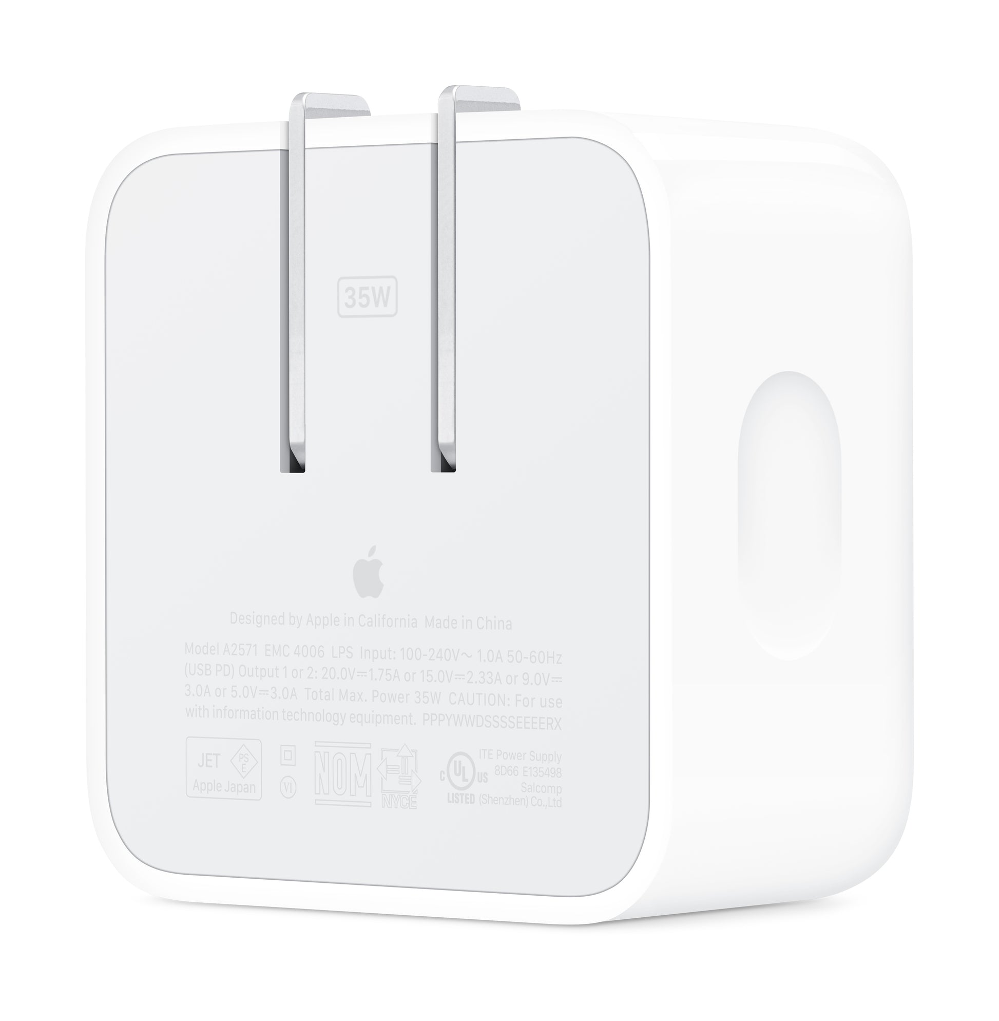 The 35W Dual USB‑C Port Power Adapter allows you to charge two devices at the same time, whether you’re at home, in the office, or on the go. Apple recommends using it with MacBook Air. You can also use it with iPhone, iPad, Apple Watch, and AirPods.