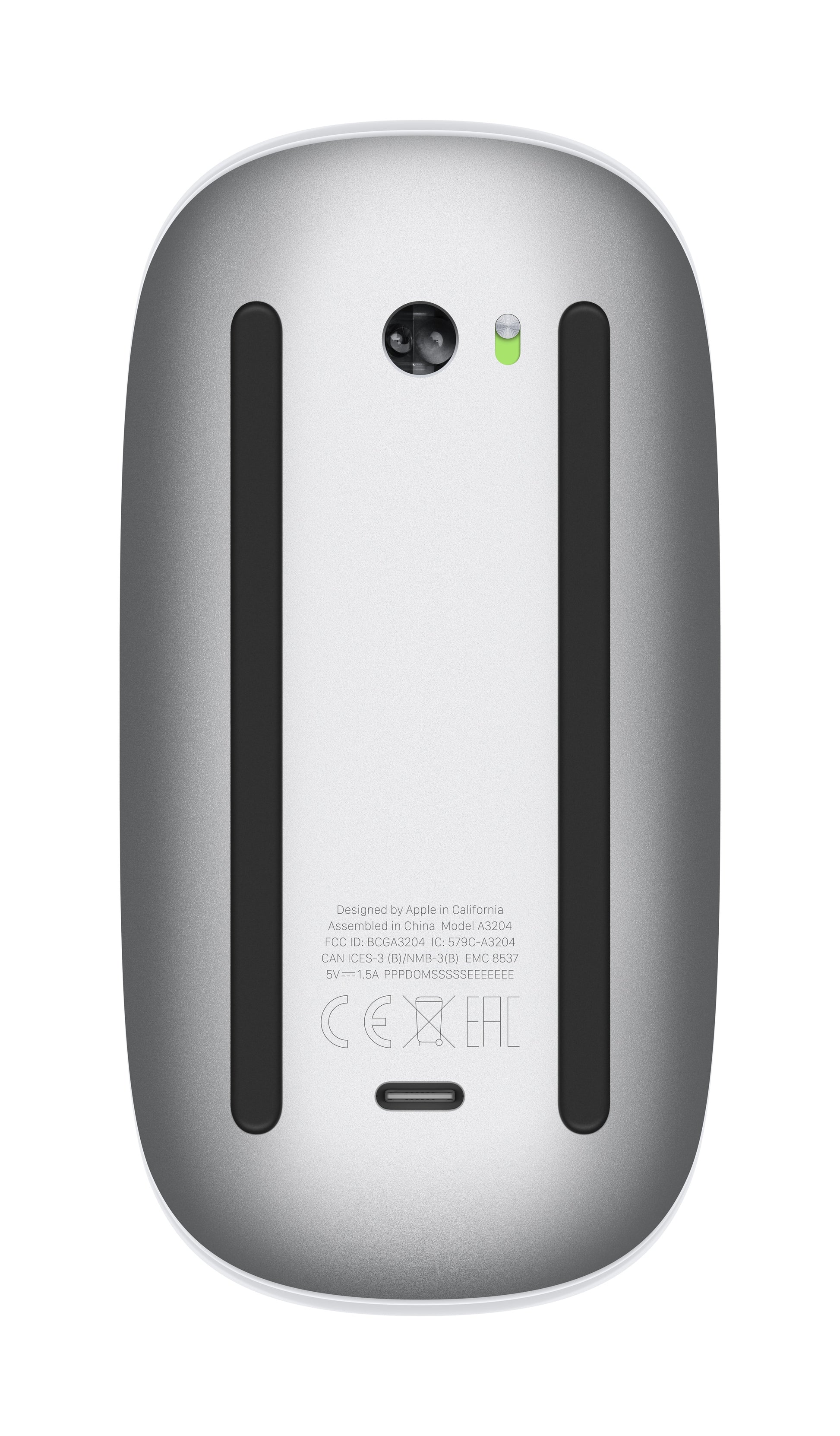 1Testing conducted by Apple in August and September 2024 using preproduction Magic Mouse (USB-C) units, firmware, and software paired with preproduction 24-inch iMac systems with Apple M4. Testing consisted of full battery discharge while engaging the device on a paired iMac using automated equipment. Battery life depends on device settings, usage, and other factors.