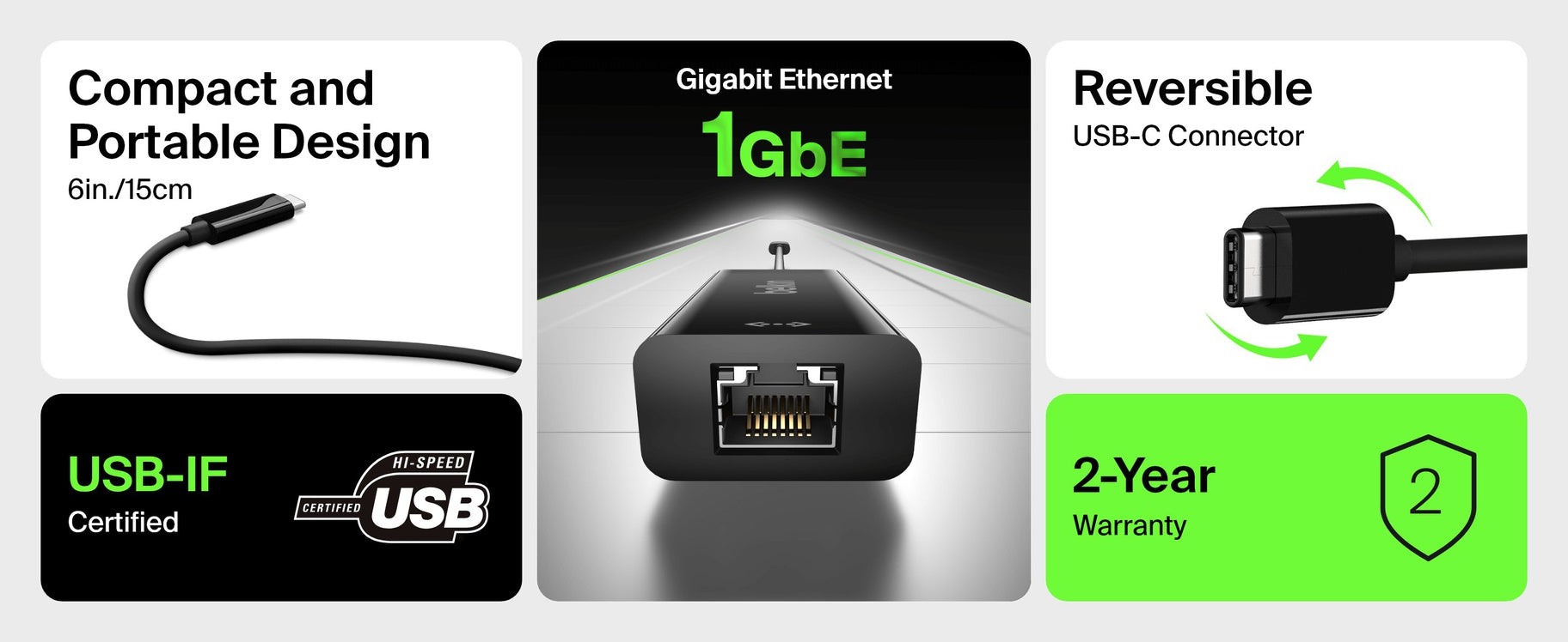 Connect your USB-C device to a wired network with this Gigabit Ethernet adapter. Delivering speeds up to 1Gbps, it ensures fast and reliable internet whether you're streaming, gaming or downloading. Its compact, plug-and-play design makes it perfect for home, office or travel.